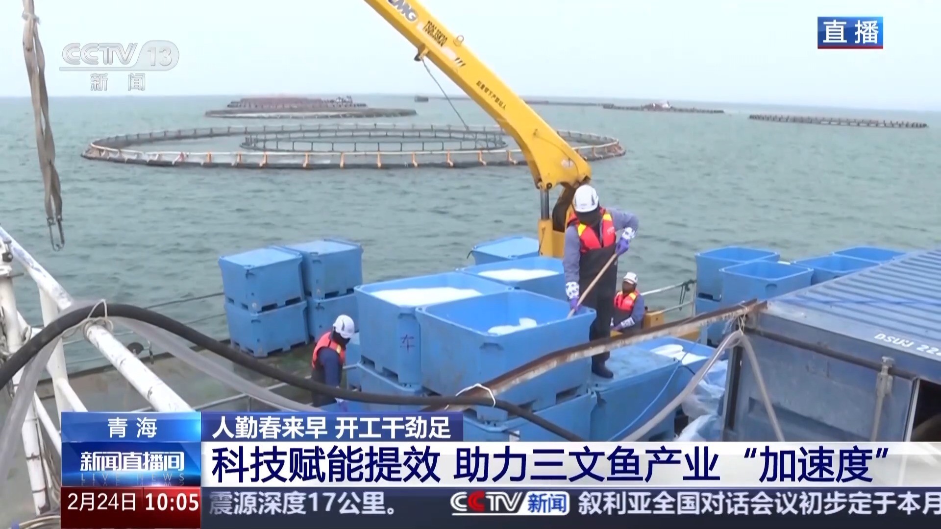总台记者 崔建军:此刻捕鱼工人们正喊着号子在我身旁的网箱里进行捕捞作业,这些活蹦乱跳的三文鱼每一条大概都有十多斤重,一网差不多有三四千斤。水面上这些大大小小的圆圈,就是当地企业设置的高原冷水鱼的养殖网箱,每年有超过1.5万吨的三文鱼被捕捞上岸,发往全国乃至世界各地。在企业看来,青海三文鱼之所以能在全球“比拼”,这份底气来源于当地优质的养殖环境,更来源于先进的养殖和加工技术。